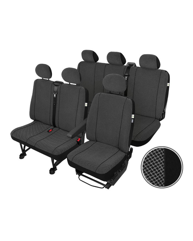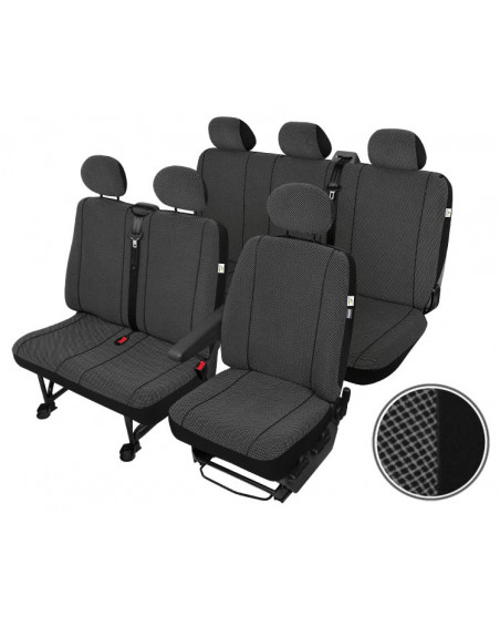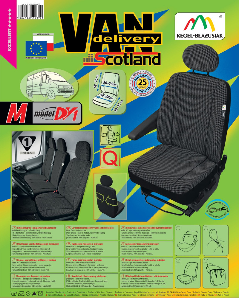 Přizpůsobené potahy SCOTLAND jsou nesmírně pěkné a praktické kryty na sedačky do dodávkových automobilů, které zajišťují uživatelům pohodlí a bezpečí. Díky výrobě z nejkvalitnějších materiálů vyvolávají jedinečný estetický dojem a zároveň chrání čalounění vašeho auta před znečištěním a před poškozením. Potahy se vyznačují dlouhou životností, odolností vůči otěru, snadno se udržují díky tomu, že jsou z vnitřní strany potažené PUR pěnou, se vyznačují vysokou přilnavostí. Silná látka společně s pěnou dobře přiléhá k sedačce. Inovativní konstrukce zajišťuje dobré přizpůsobení potahů konkrétním modelům aut. Materiál, z něhož se potahy vyrábějí, splňují nejvyšší odolnostní normy. Udržuje si tmavou tlumenou barevnost, skvěle vypadá uvnitř každého vozidla. Vkusný bílý vzor na černé látce jim dodávají elegantní a šik vzhled. Poskytnuta až do 25-měsíční záruka vám dá jistotu, že kupujete nejvyšší kvality výrobku.