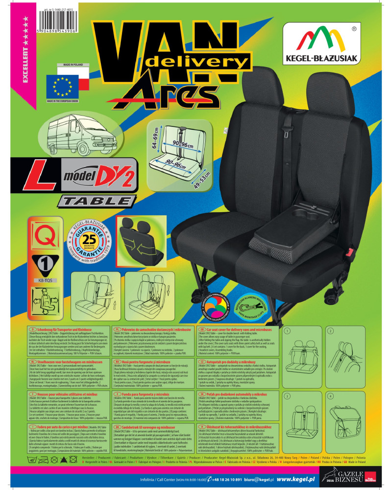 Přizpůsobené potahy ARES - praktické a bezpečné autopotahy navržené s ohledem na majitele dodávkových automobilů a mikrobusů - profesionálně ušité z hoření zpomalující žakárové látky vysoké kvality. Přesně z těch samých materiálů se vyrábějí originální potahy na sedačkách nových vozidel pro automobilky. Pečlivě ušité a důkladně propracované. Díky správnému střihu a vhodným rozměrům se skvěle přizpůsobí tvaru sedadel konkrétních modelů automobilů. Díky potažení PUR pěnou na vnitřní straně se vůči sedačce neposouvá. Potahy ARES efektivně chrání čalounění před prodřením, znečištěním a zničením, také uvnitř vozidla skvěle vypadají. Potahy jsou celé vyrobené z pevné, odolné, silné žakárové látky. Látka má černou barvu - černá s jemnou šedou texturou ideálně zapadne do interiéru každého automobilu. Poskytnuta až do 25-měsíční záruka vám dá jistotu, že kupujete nejvyšší kvality výrobku.