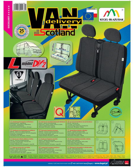 Přizpůsobené potahy SCOTLAND jsou nesmírně pěkné a praktické kryty na sedačky do dodávkových automobilů, které zajišťují uživatelům pohodlí a bezpečí. Díky výrobě z nejkvalitnějších materiálů vyvolávají jedinečný estetický dojem a zároveň chrání čalounění vašeho auta před znečištěním a před poškozením. Potahy se vyznačují dlouhou životností, odolností vůči otěru, snadno se udržují díky tomu, že jsou z vnitřní strany potažené PUR pěnou, se vyznačují vysokou přilnavostí. Silná látka společně s pěnou dobře přiléhá k sedačce. Inovativní konstrukce zajišťuje dobré přizpůsobení potahů konkrétním modelům aut. Materiál, z něhož se potahy vyrábějí, splňují nejvyšší odolnostní normy. Udržuje si tmavou tlumenou barevnost, skvěle vypadá uvnitř každého vozidla. Vkusný bílý vzor na černé látce jim dodávají elegantní a šik vzhled. Poskytnuta až do 25-měsíční záruka vám dá jistotu, že kupujete nejvyšší kvality výrobku.