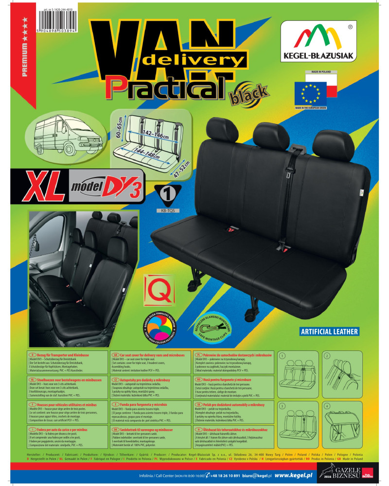 Potahy na miru PRACTICAL byly vyrobeny z nesmírně stálé ekokůže nové generace, což v kombinaci s péčí o zakončení i těch nejmenších detailů uspokojí dokonce i ty nejnáročnější zákazníky. Správně nasazené potahy jsou prakticky k nerozeznání od originálního koženého čalounění sedadel a tohoto efektu lze dosáhnout za skutečně nízkou cenu. Potah se vyrábí ze silného a stálého materiálu a díky správnému střihu se dobře přizpůsobí sedačkám a přilne k nim, čímž se zabraňuje posouvání potahu. Potahy do auta PRACTICAL velmi dobře chrání originální čalounění auta před prodřením a zničením a vkusný, moderní styl vyvolává pozitivní estetické dojmy. Potah se velice snadno instaluje a čistí. Poctivé provedení zaručuje vysokou kvalitu a dlouhou dobu používání. Nepromokavý, nešpinící se a nesmírně odolný materiál zajišťuje praktické používání. Nabídka cílí na majitele dodávkových automobilů, kteří se chtějí postarat o interiér svých vozidel a dodat jim šik a eleganci. Černá univerzální barevnost ideálně doplní interiér každého vozidla. Potahy vypadají skvěle v každém autě. Jsou výjimečně elegantní, proto také díky nim každý interiér získá na úrovni a na půvabu.