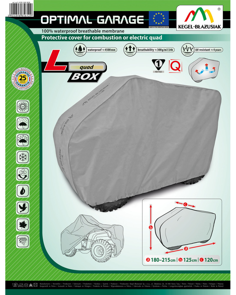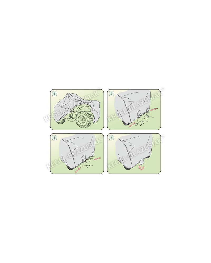 Vysoce kvalitní plachty na čtyřkolku - voděodolné a paropropustné. Chrání celé čtyřkolku společně s jeho dolní částí před škodlivým vlivem prostředí. Jsou odolné vůči působení UV záření. Upevňuje se s pomocí stahovacího lemu s lankem kolem celého vozidla, v případě správného zavázání zaručuje bezpečnost i během nárazů větru. Díky širokému spektru tvarů a barev jsou potahy dobře přizpůsobeny různým čtyřkolek. Poskytnuta až do 25-měsíční záruka vám dá jistotu, že kupujete nejvyšší kvality výrobku.