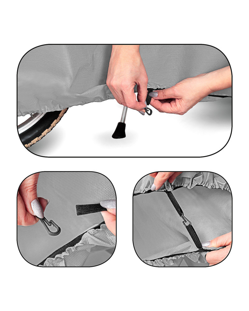 Jízdní kolo zaparkujte na místě, které není vystaveno působení větru, a zajistěte ho proti převrácení. Krycí plachtu nasaďte na čisté a suché jízdní kolo tak, aby její strana s potiskem byla na vnější straně, a pak pomocí přiloženého háčku spojte upevňovací smyčky pod rámem kola. Krycí plachtu nepoužívejte během převozu jízdního kola na nekrytých korbách nebo nosičích vozidel.