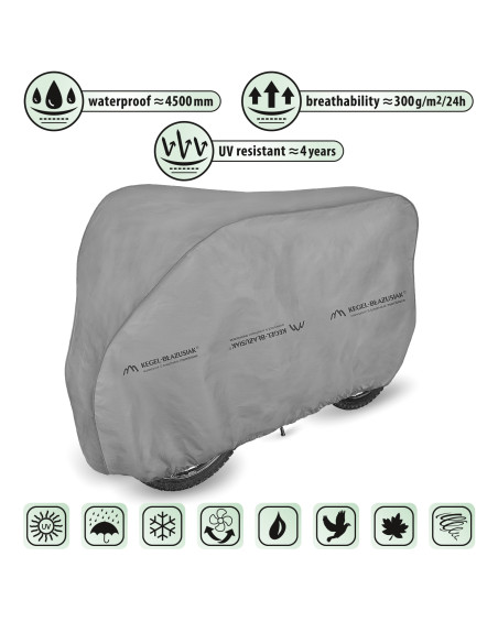 Membránová, nepromokavá a současně prodyšná krycí plachta na jízdní kolo parkované venku k jeho ochraně proti nepříznivému vlivu prostředí. Krycí plachta je vyrobená z membrány s vysokou prodyšností (prostupností par) a je odolná proti povětrnostním vlivům. Zůstává nepromokavá dokonce i za intenzívního deště, zároveň je prodyšná a odvádí vlhkost ven. Snižuje působení koroze a stárnutí plastových součástí, chrání svrchní lak a chromované prvky proti blednutí a ztrátě lesku. Připevňuje se pomocí pružné stahovací tkanice, a proto se snadno nasazuje i sundává. Dodatečné zapínání pod kolem ji chrání proti stržení větrem. Je určená ke krátkodobému i dlouhodobému venkovnímu parkování jízdního kola bez elektrického pohonu. Je vhodná také k použití uvnitř budov.