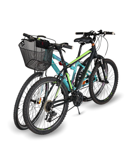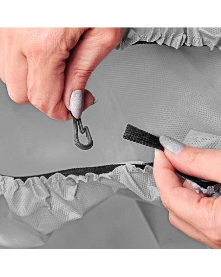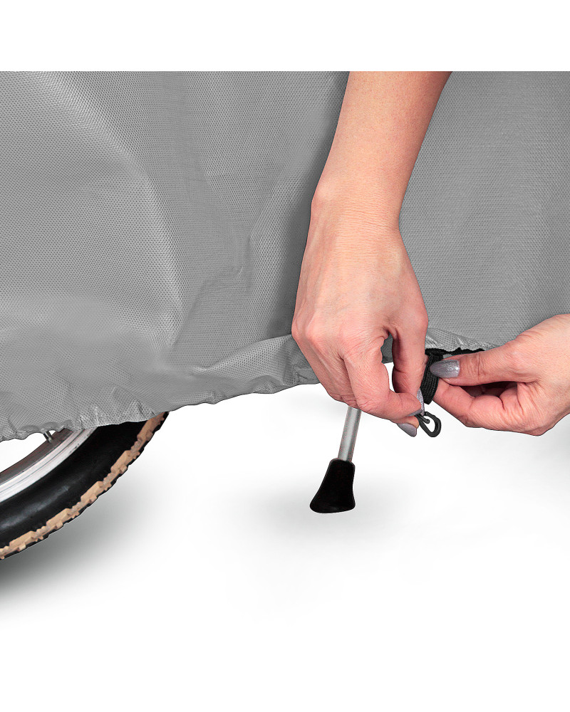 Zakryjte plachtou čistá jízdní kola podle fotografie. Pomocí přiloženého háčku spojte upevňovací smyčky pod rámy jízdních kol.