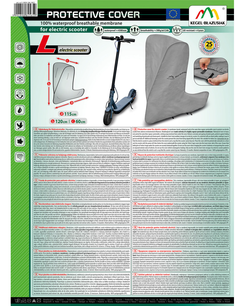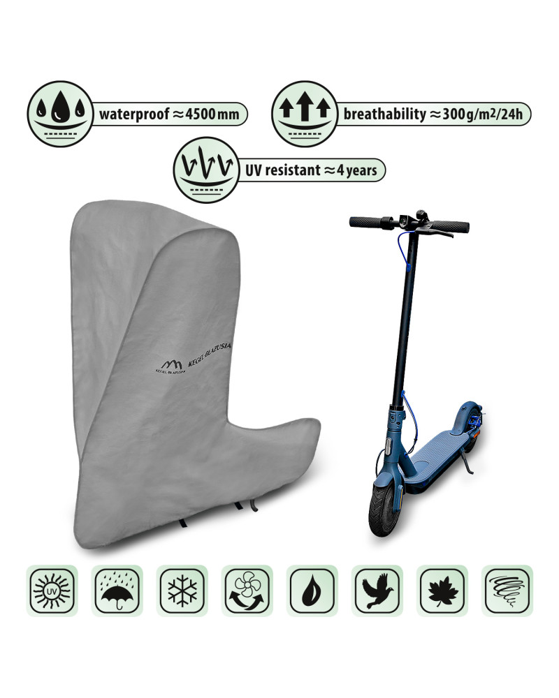 Nepromokavá a zároveň prodyšná membránová krycí plachta k ochraně elektrokoloběžky proti nepříznivému počasí. Krycí plachta je vyrobená z membrány s vysokou prodyšností (prostupností par) a je odolná proti povětrnostním vlivům. Zůstává nepromokavá dokonce za intenzívního deště, zároveň je prodyšná a odvádí vlhkost ven. Snižuje působení koroze a stárnutí plastových součástí, chrání svrchní lak a chromované prvky proti blednutí a ztrátě lesku. Je určená ke krátkodobému uschování elektrokoloběžky venku. Připevňuje se pomocí pružné stahovací tkanice, a proto se snadno nasazuje i sundává. Dodatečné popruhy pod koloběžkou ji chrání proti stržení větrem. Lze ji používat také uvnitř bud