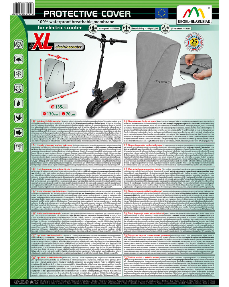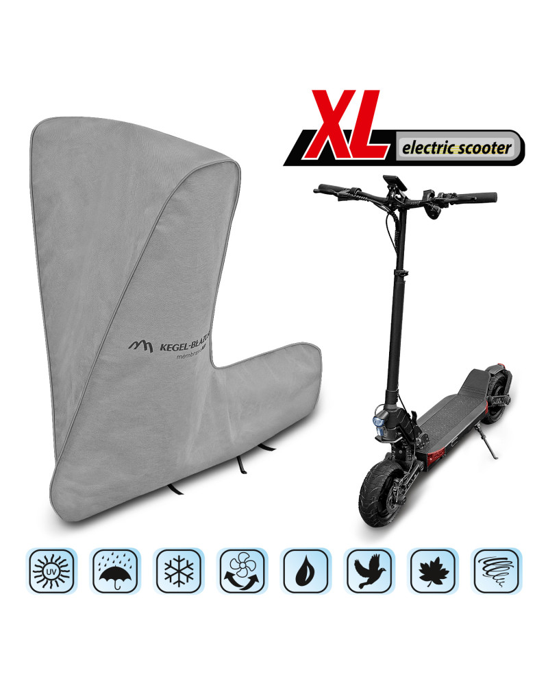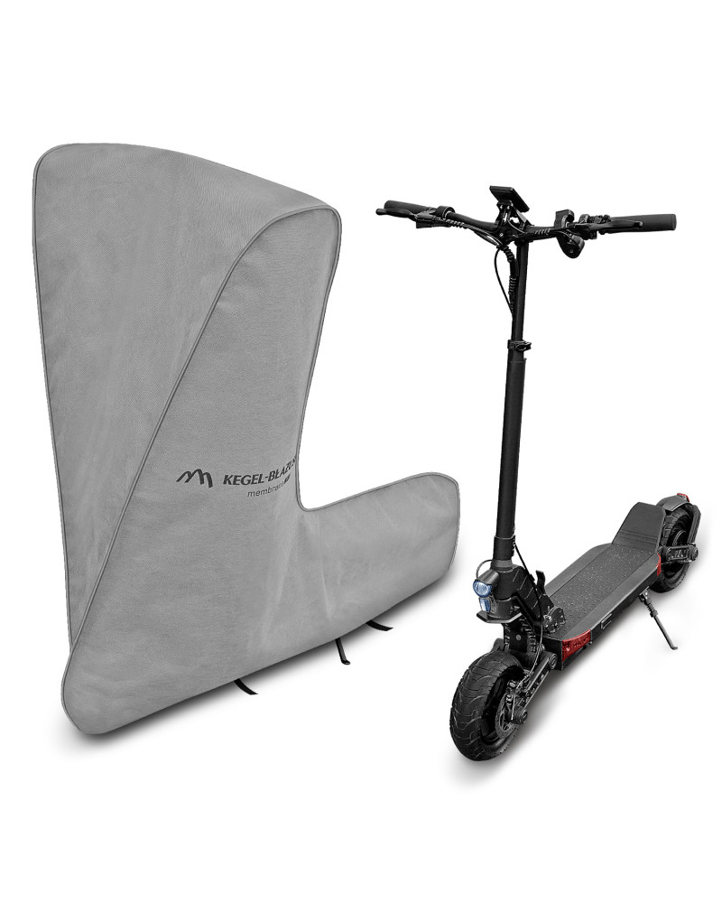 Nepromokavá a zároveň prodyšná membránová krycí plachta k ochraně elektrokoloběžky proti nepříznivému počasí. Krycí plachta je vyrobená z membrány s vysokou prodyšností (prostupností par) a je odolná proti povětrnostním vlivům. Zůstává nepromokavá dokonce za intenzívního deště, zároveň je prodyšná a odvádí vlhkost ven. Snižuje působení koroze a stárnutí plastových součástí, chrání svrchní lak a chromované prvky proti blednutí a ztrátě lesku. Je určená ke krátkodobému uschování elektrokoloběžky venku. Připevňuje se pomocí pružné stahovací tkanice, a proto se snadno nasazuje i sundává. Dodatečné popruhy pod koloběžkou ji chrání proti stržení větrem. Lze ji používat také uvnitř bud