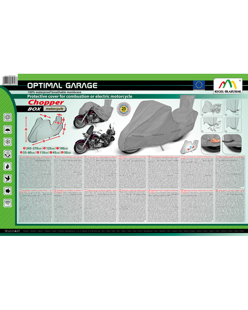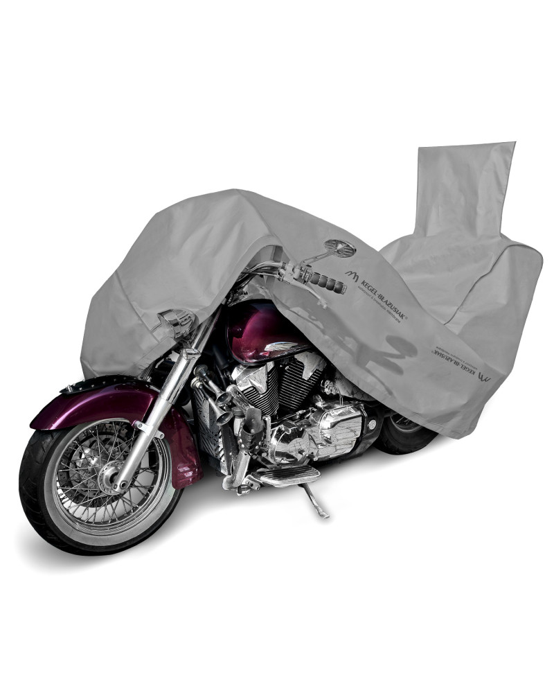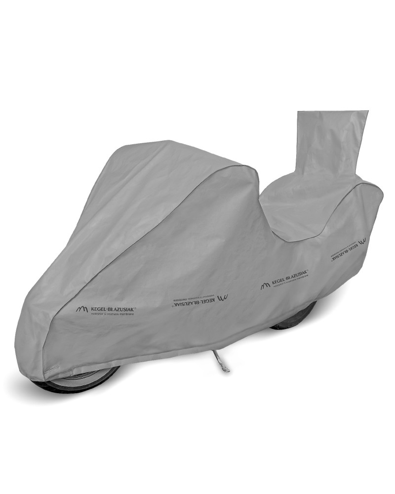 Nepromokavá a zároveň prodyšná membránová krycí plachta k ochraně motocyklu se spalovacím nebo elektrickým motorem proti nepříznivému počasí. Krycí plachta je vyrobená z membrány s vysokou prodyšností (prostupností par) a je odolná proti povětrnostním vlivům. Zůstává nepromokavá dokonce za intenzívního deště, zároveň je prodyšná a odvádí vlhkost ven. Chrání proti dešti, sněhu, jinovatce, slunečním paprskům (škodlivému UV záření) a nečistotám, jako je prach, ptačí trus nebo míza stromů. Snižuje působení koroze a stárnutí plastových součástí, chrání svrchní lak a chromované prvky proti blednutí a ztrátě lesku. Je určená ke krátkodobému i dlouhodobému venkovnímu parkování motocyklu se spalovacím motorem a ke krátkodobému venkovnímu parkování motocyklu s elektromotorem. Je vhodná také k použití uvnitř budov. Stahovací lanko a dodatečné zapínání pod motocyklem ji chrání proti stržení větrem. V krycí plachtě se nacházejí otvory, přes které je motocykl možné uzamknout za přední kolo pomocí zámku ke stojanu.