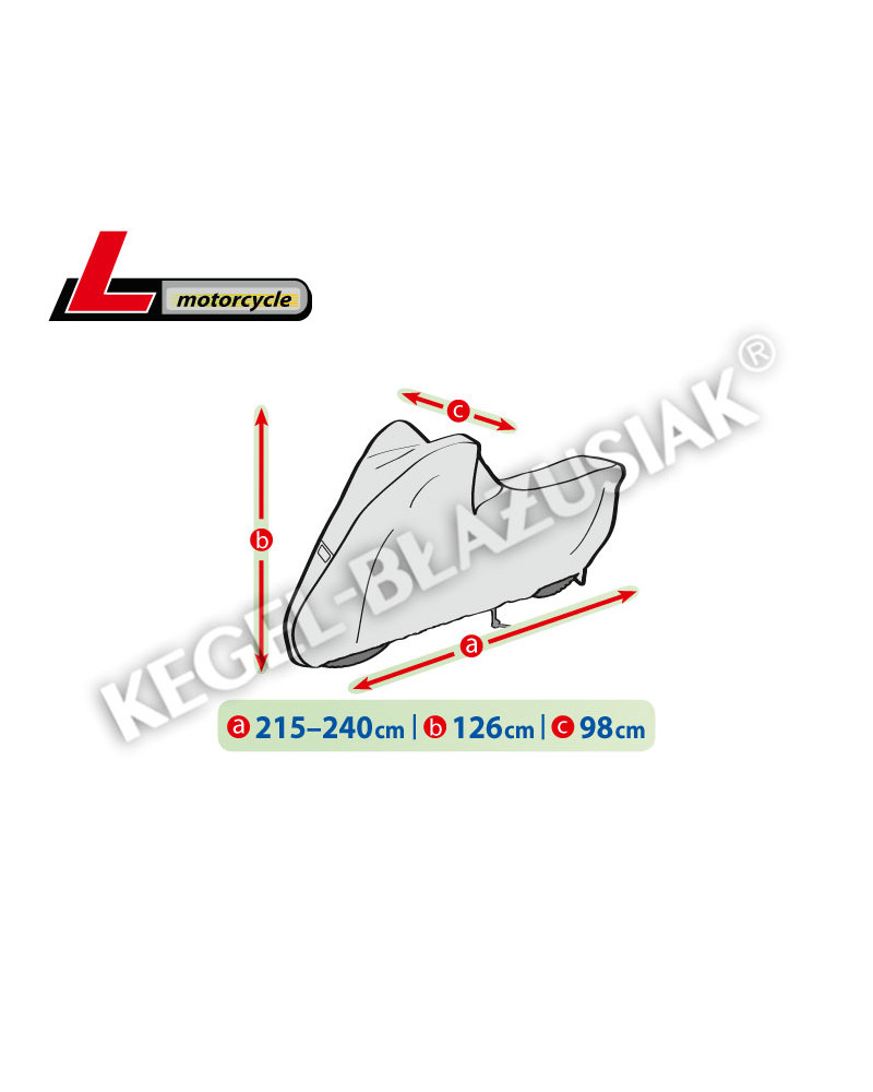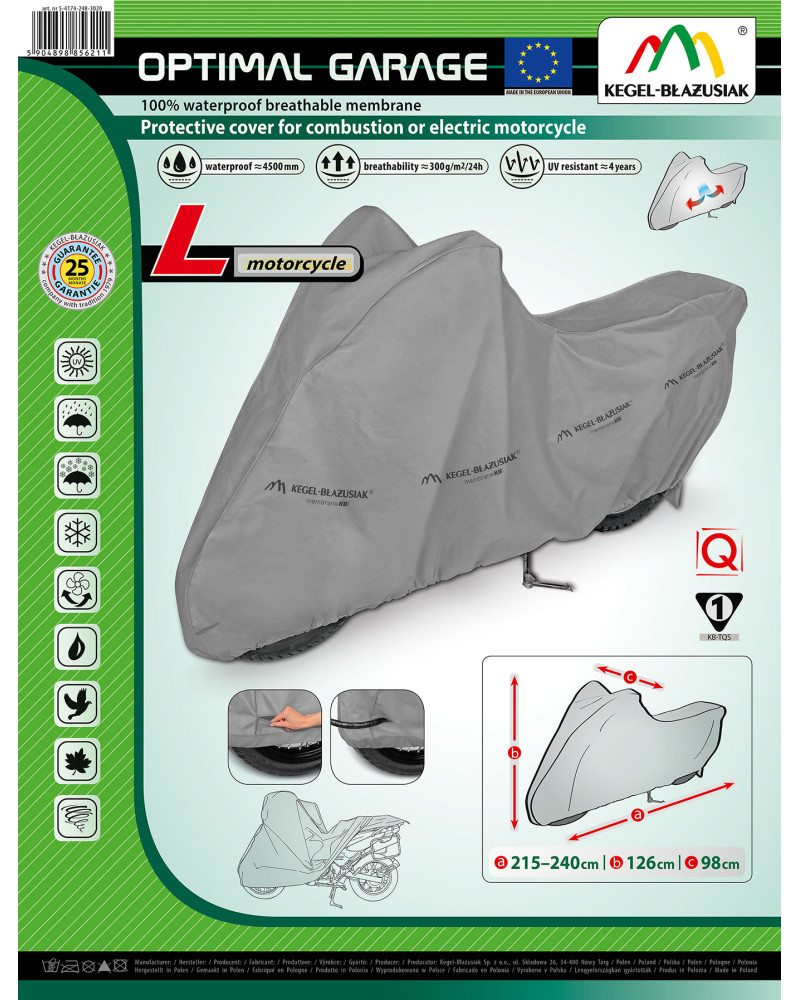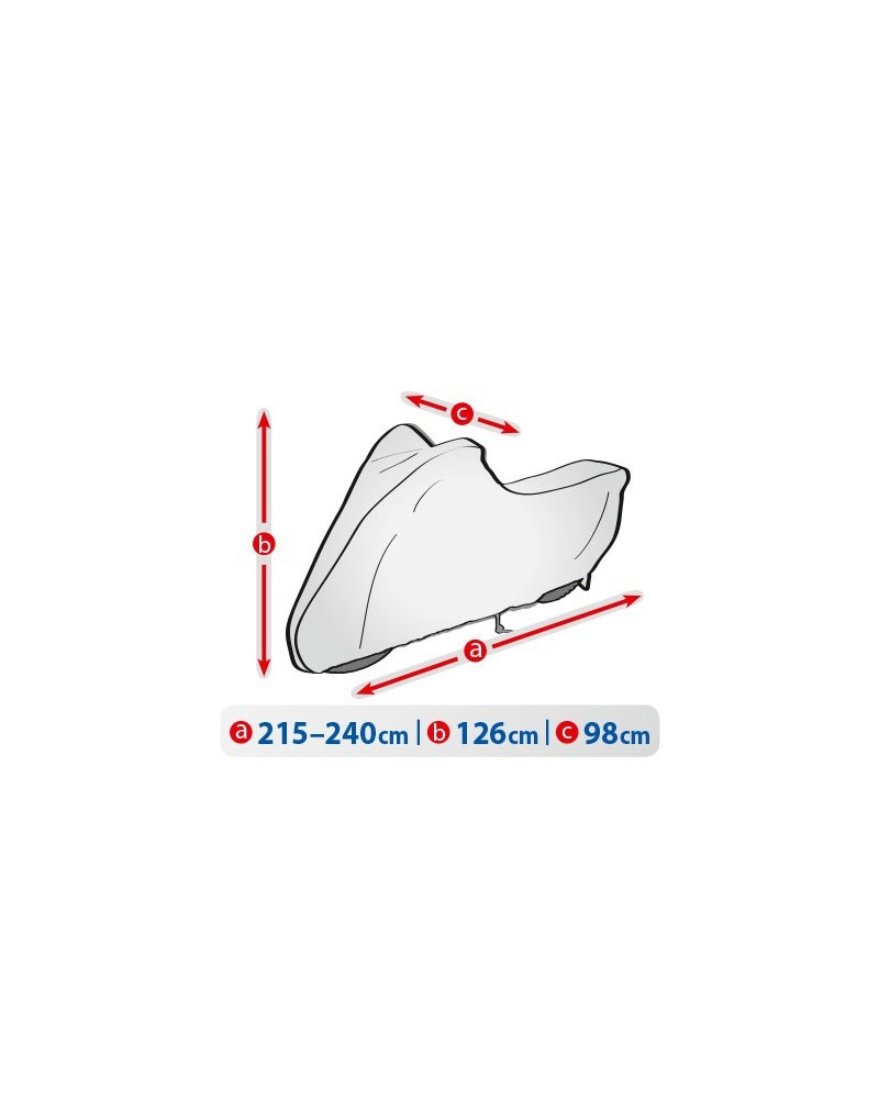 Nepromokavá a zároveň prodyšná membránová krycí plachta k ochraně motocyklu se spalovacím nebo elektrickým motorem proti nepříznivému počasí. Krycí plachta je vyrobená z membrány s vysokou prodyšností (prostupností par) a je odolná proti povětrnostním vlivům. Zůstává nepromokavá dokonce za intenzívního deště, zároveň je prodyšná a odvádí vlhkost ven. Chrání proti dešti, sněhu, jinovatce, slunečním paprskům (škodlivému UV záření) a nečistotám, jako je prach, ptačí trus nebo míza stromů. Snižuje působení koroze a stárnutí plastových součástí, chrání svrchní lak a chromované prvky proti blednutí a ztrátě lesku. Je určená ke krátkodobému i dlouhodobému venkovnímu parkování motocyklu se spalovacím motorem a ke krátkodobému venkovnímu parkování motocyklu s elektromotorem. Je vhodná také k použití uvnitř budov. Stahovací lanko a dodatečné zapínání pod motocyklem ji chrání proti stržení větrem. V krycí plachtě se nacházejí otvory, přes které je motocykl možné uzamknout za přední kolo pomocí zámku ke stojanu.
