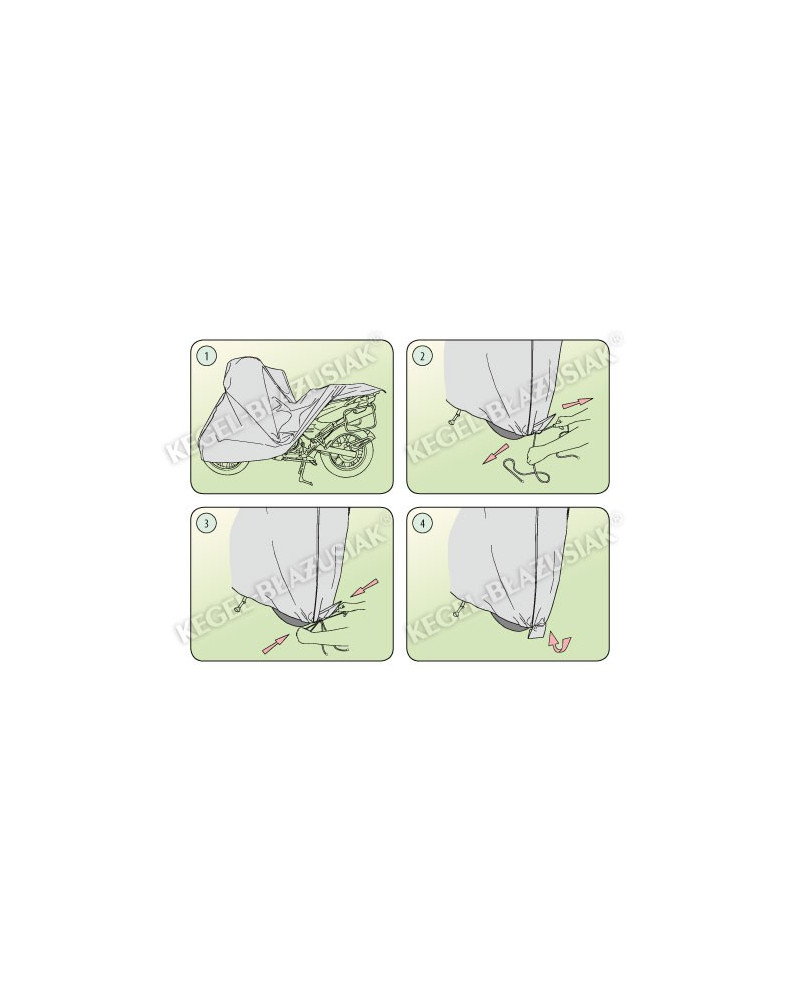 Nasaďte volný potah na relativně čisté motocykl, bílou stranou středového pásu dovnitř a následně maximálně silně zatáhněte za lanko stahovacího lemu plachty a správně ho zavažte. Jen správné šněrování zaručí odolnost vázání. Zavažte lanko podle návodu a budete mít jistotu, že je potah pevně a silně připevněn a vaše auto je tak v bezpečí. Doporučené zavazování umožňuje spojení dvou konců lanka a zároveň umožňuje rychle ho rozvázat.