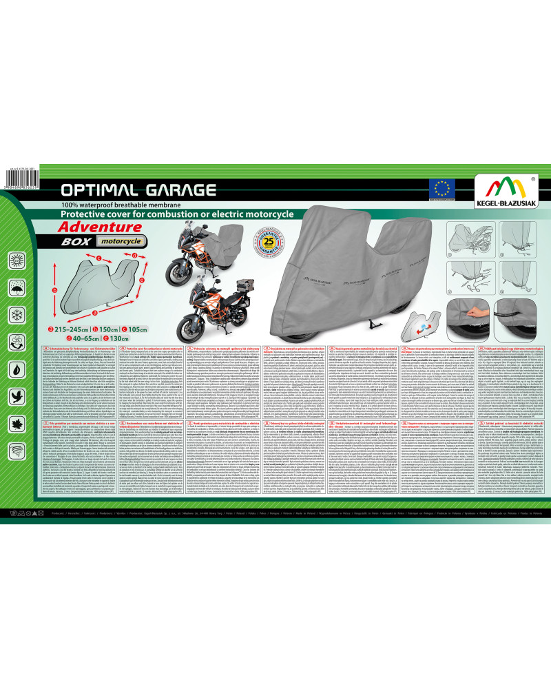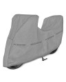 Nepromokavá a zároveň prodyšná membránová krycí plachta k ochraně motocyklu se spalovacím nebo elektrickým motorem proti nepříznivému počasí. Krycí plachta je vyrobená z membrány s vysokou prodyšností (prostupností par) a je odolná proti povětrnostním vlivům. Zůstává nepromokavá dokonce za intenzívního deště, zároveň je prodyšná a odvádí vlhkost ven. Chrání proti dešti, sněhu, jinovatce, slunečním paprskům (škodlivému UV záření) a nečistotám, jako je prach, ptačí trus nebo míza stromů. Snižuje působení koroze a stárnutí plastových součástí, chrání svrchní lak a chromované prvky proti blednutí a ztrátě lesku. Je určená ke krátkodobému i dlouhodobému venkovnímu parkování motocyklu se spalovacím motorem a ke krátkodobému venkovnímu parkování motocyklu s elektromotorem. Je vhodná také k použití uvnitř budov. Stahovací lanko a dodatečné zapínání pod motocyklem ji chrání proti stržení větrem. V krycí plachtě se nacházejí otvory, přes které je motocykl možné uzamknout za přední kolo pomocí zámku ke stojanu.