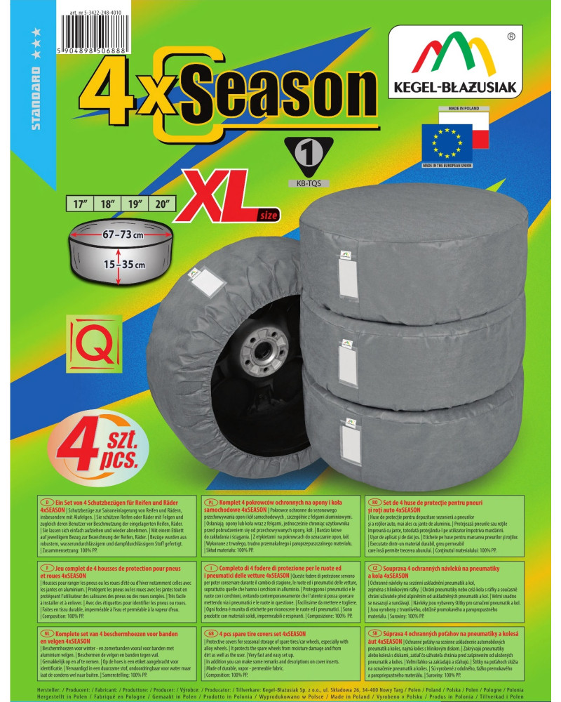 Sada 4 vysoce kvalitních potahů SEASON – určených k sezónnímu skladování pneumatik a automobilových kol, obzvláště těch s hliníkovými disky (kryjí pneumatiky společně s disky). Jsou vyrobeny z nesnadno promokavého, paropropustného materiálu, který zajišťuje správnou cirkulaci vzduchu uvnitř potahů a zabraňuje vzniku koroze. Velmi dobře vypadají v garáži. Během delší přestávky v jejich používání se na nich neusazuje prach. Po stažení potahu budou kola/pneumatiky jako nové - zůstanou ve stejném stavu, v jakém jsme je zanechali. Potahy během zvedání kol velmi dobře chrání před znečištěním oblečení. Potahy mají všitou kapsičku na popisový štítek pneumatiky/kola. Velice snadno se nasazují a stahují.
