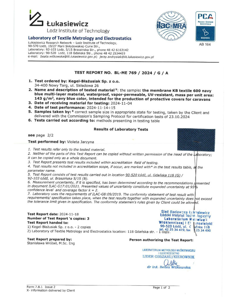 Dobrá krycí plachta musí chránit automobil nejen před atmosférickými srážkami, znečištěním a slunečními paprsky, ale musí být také bezpečná. Právě takové jsou krycí plachty na auta značky Kegel-Błażusiak. Naši odborníci se věnují dlouhodobým zkouškám krycích plachet na automobily. Testujeme je z hlediska účinnosti ochrany proti povětrnostním vlivům, odolnosti proti vodě, propustnosti vodních par směrem ven, bezpečnosti materiálu plachty vůči laku vozidla a účinnosti připevnění plachty na vozidle za běžného i extrémního počasí. Na trh dodáváme pouze takové výrobky, které v dlouhodobých testech dopadly pozitivně.