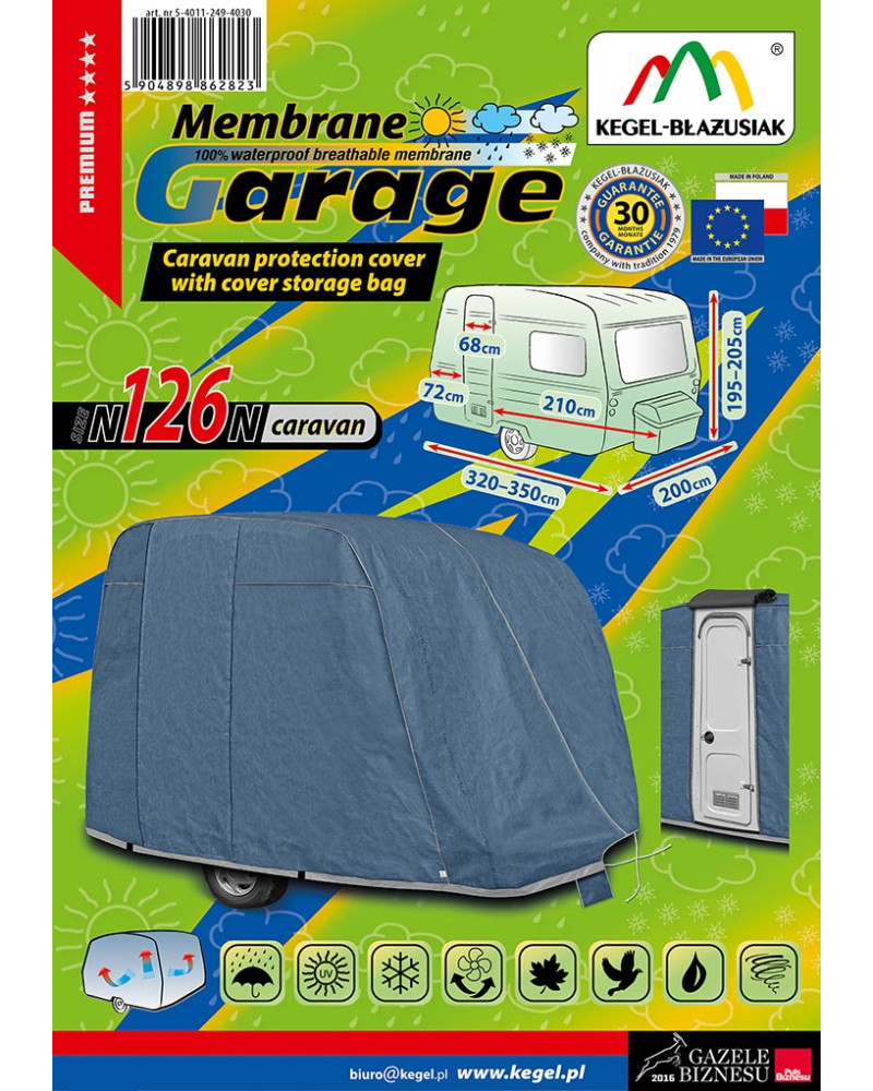 Ušitá z nepromokavé paropropustné membrány a nesnadno promokavých, velmi dobře páru propouštějících látek zajišťuje správný oběh vzduchu uvnitř plachty. Uchovává si téměř úplnou těsnost, zároveň zabraňuje hromadění vlhkosti uvnitř plachty. Je dobře přizpůsobená. Díky své konstrukci a zvláštním vlastnostem efektivně chrání celý přívěs (společně s dolními částmi) před nepříznivým vlivem prostředí. Je odolná vůči působení UV záření. Chrání před deštěm, sněhem, námrazou, větrem, pylem rostlin, listy, šťávami ze stromů, ptačími exkrementy. Zabraňuje blednutí, zmatnění laku a chromovaných dílů. Chrání před většinou poškrábání. Omezuje korozi. Díky silnému připevnění s pomocí na spony zapínaných pásů zaručuje bezpečnost dokonce i v případě silných nárazů větru. Velmi snadno se nasazuje a sundává a po složení nezabere příliš místa. Z vnitřní strany plachty je materiál hladký, bezpečný pro karosérii a jiné části vozidla - nezpůsobuje poškrábání. Je vyrobena v tmavě popelavé barvě - tlumené a praktické, s tmavě modrými detaily. Membrane Garage je vícesezónní výrobek, který vám bude sloužit po mnoho let. Poskytnuta až do 30-měsíční záruka vám dá jistotu, že kupujete nejvyšší kvality výrobku.