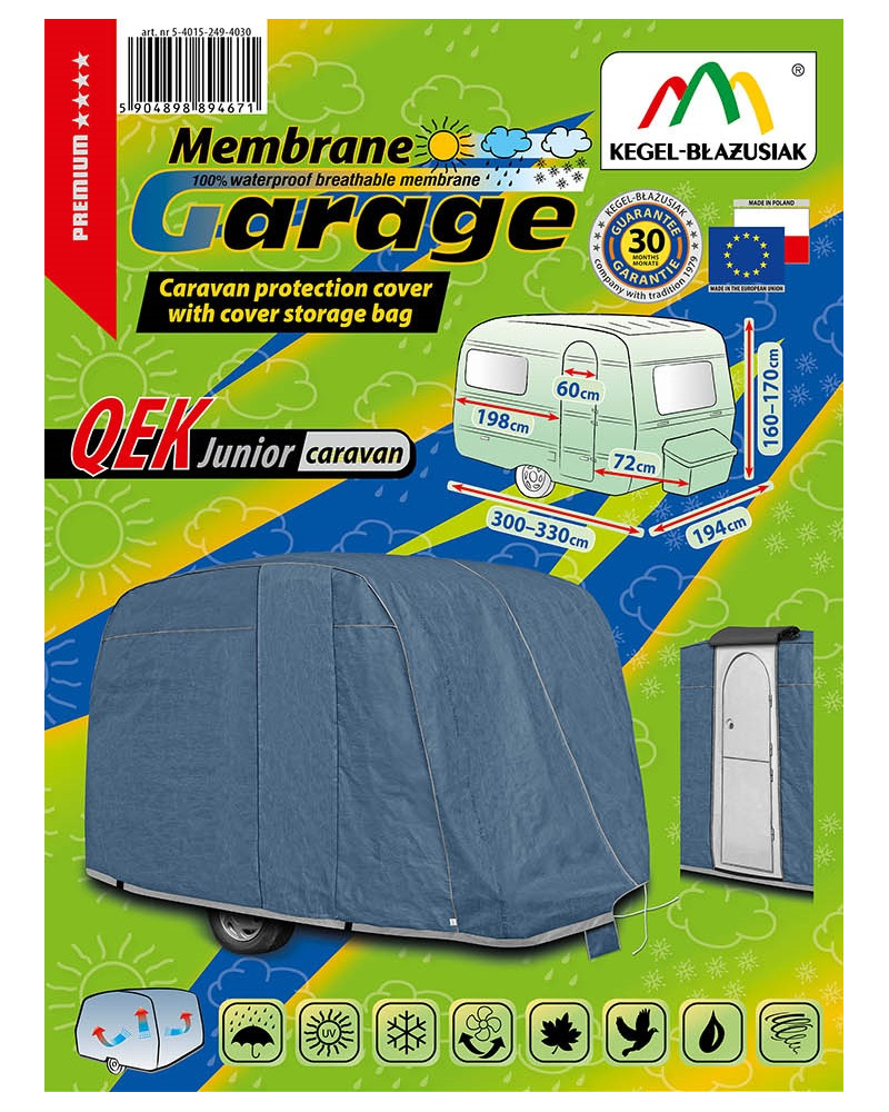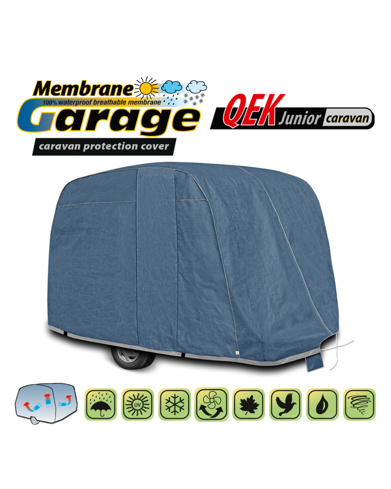 Ušitá z nepromokavé paropropustné membrány a nesnadno promokavých, velmi dobře páru propouštějících látek zajišťuje správný oběh vzduchu uvnitř plachty. Uchovává si téměř úplnou těsnost, zároveň zabraňuje hromadění vlhkosti uvnitř plachty. Je dobře přizpůsobená. Díky své konstrukci a zvláštním vlastnostem efektivně chrání celý přívěs (společně s dolními částmi) před nepříznivým vlivem prostředí. Je odolná vůči působení UV záření. Chrání před deštěm, sněhem, námrazou, větrem, pylem rostlin, listy, šťávami ze stromů, ptačími exkrementy. Zabraňuje blednutí, zmatnění laku a chromovaných dílů. Chrání před většinou poškrábání. Omezuje korozi. Díky silnému připevnění s pomocí na spony zapínaných pásů zaručuje bezpečnost dokonce i v případě silných nárazů větru. Velmi snadno se nasazuje a sundává a po složení nezabere příliš místa. Z vnitřní strany plachty je materiál hladký, bezpečný pro karosérii a jiné části vozidla - nezpůsobuje poškrábání. Je vyrobena v tmavě popelavé barvě - tlumené a praktické, s tmavě modrými detaily. Membrane Garage je vícesezónní výrobek, který vám bude sloužit po mnoho let. Poskytnuta až do 30-měsíční záruka vám dá jistotu, že kupujete nejvyšší kvality výrobku.