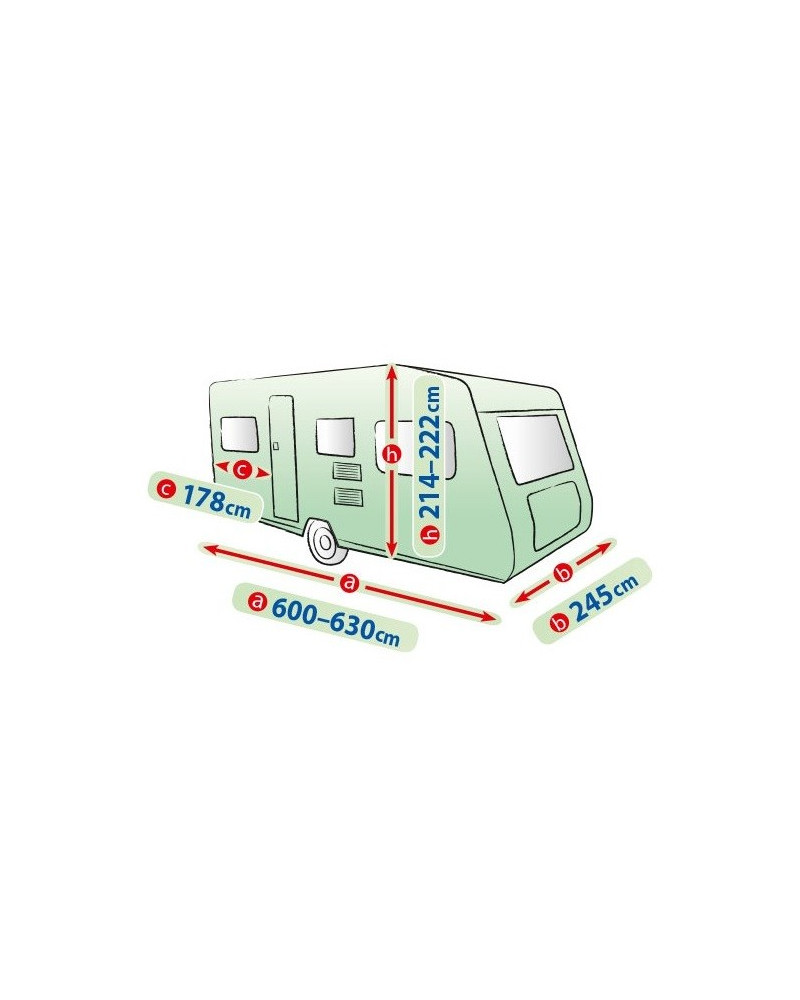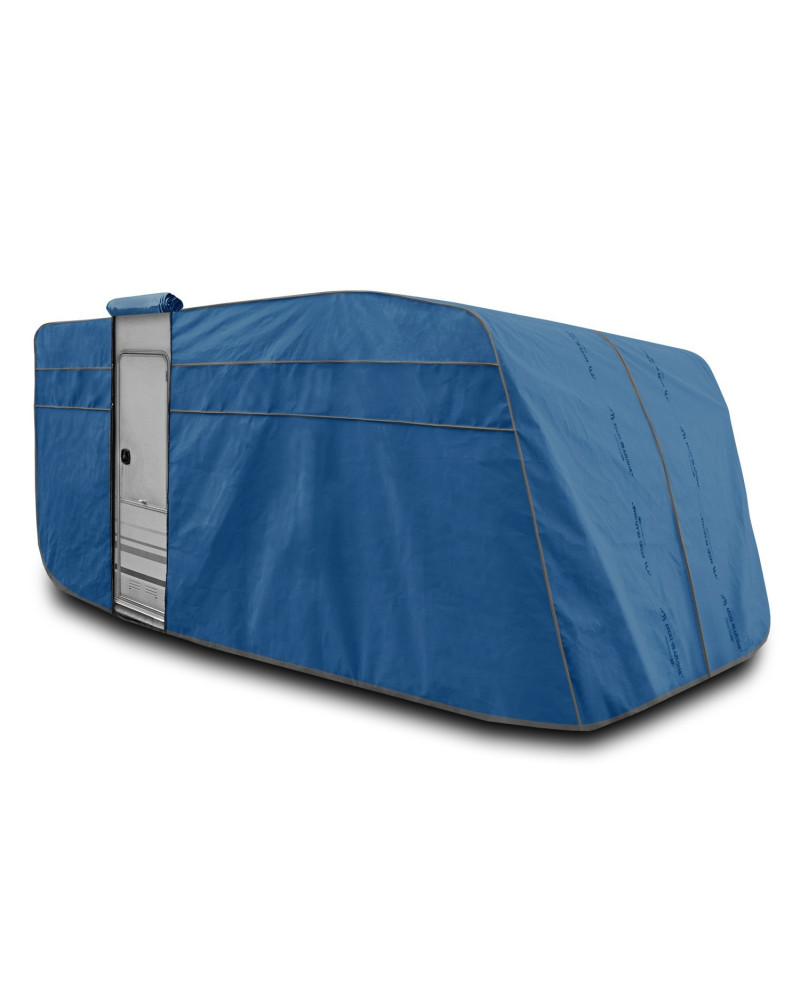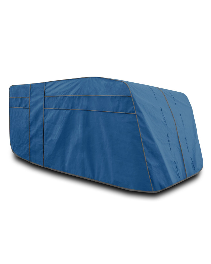 Čistý a suchý obytný přívěs přikryjte plachtou tak, aby bílá strana plachty směřovala dovnitř (potiskem směrem ven). K nasazení plachty bez použití žebříku je zapotřebí dvou lidí se dvěma silnými tyčemi dlouhými 1,5 metru nebo delšími podle výšky přívěsu (tyče nejsou součástí plachty). Nejdříve za přívěsem roztáhněte velký kus čisté látky nebo fólie, abyste plachtu zabezpečili proti znečištění. Na rozloženou látku za přívěsem položte krycí plachtu orientovanou stranami podle přívěsu. Pro snadnější nasazování na přívěs je do plachty našitá nášivka FRONT v její přední části a REAR v její zadní části (označení odpovídá přední a zadní straně přívěsu). Do předních spodních rohů plachty jsou našité držáky tyčí ve formě kapes. Tyče do nich zasuňte. Ve dvou lidech musíte pomocí tyčí nadzvednout plachtu nad zadní část přívěsu, přetáhnout ji nad střechou (jeden člověk na levé a druhý na pravé straně přívěsu) k jeho přednímu konci a tímto způsobem přikrýt celý přívěs plachtou. Potom stáhněte a zavažte spodní stahovací lanko plachty. Věnujte přitom pozornost tomu, abyste před stažením překřížili oba konce lanka a vytvořili první křížení uzlu, potom silně zatáhněte konce rovnoměrnou silnou ve směru přední strany přívěsu. Zavažte konce stahovacího lanka na uzel a zkontroluje, zda se uzel při zatažení za lanko neuvolňuje. Pokud se uzel uvolní, zopakujte předchozí krok, ale použijte jiný způsob vázání uzlu. Do spodního okraje plachty jsou všité upevňovací pásy, které musíte všechny protáhnout pod přívěsem přes nejbližší otvory v jeho nosné konstrukci a pak pásy sepnout sponami a stáhnout.