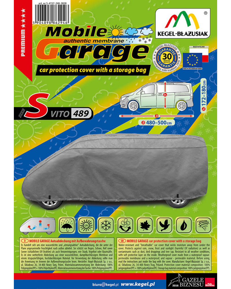 Vysoce kvalitní plachty na auto MOBILE GARAGE- voděodolné a paropropustné. Jsou ušité z nepromokavé paropropustné membrány a nesnadno promokavých materiálů, které velice dobře propouštějí páru, zachovávají si téměř naprostou těsnost a zároveň odvádějí vlhkost hromadící se pod potahem. Chrání celé auto společně s jeho dolní částí před škodlivým vlivem prostředí. Jsou odolné vůči působení UV záření. Upevňuje se s pomocí stahovacího lemu s lankem kolem celého vozidla, v případě správného zavázání zaručuje bezpečnost i během nárazů větru. Díky širokému spektru tvarů a barev jsou potahy dobře přizpůsobeny různým automobilům. Poskytnuta až do 30-měsíční záruka vám dá jistotu, že kupujete nejvyšší kvality výrobku.