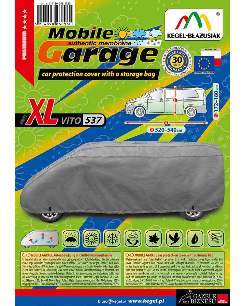 Vysoce kvalitní plachty na auto MOBILE GARAGE- voděodolné a paropropustné. Jsou ušité z nepromokavé paropropustné membrány a nesnadno promokavých materiálů, které velice dobře propouštějí páru, zachovávají si téměř naprostou těsnost a zároveň odvádějí vlhkost hromadící se pod potahem. Chrání celé auto společně s jeho dolní částí před škodlivým vlivem prostředí. Jsou odolné vůči působení UV záření. Upevňuje se s pomocí stahovacího lemu s lankem kolem celého vozidla, v případě správného zavázání zaručuje bezpečnost i během nárazů větru. Díky širokému spektru tvarů a barev jsou potahy dobře přizpůsobeny různým automobilům. Poskytnuta až do 30-měsíční záruka vám dá jistotu, že kupujete nejvyšší kvality výrobku.