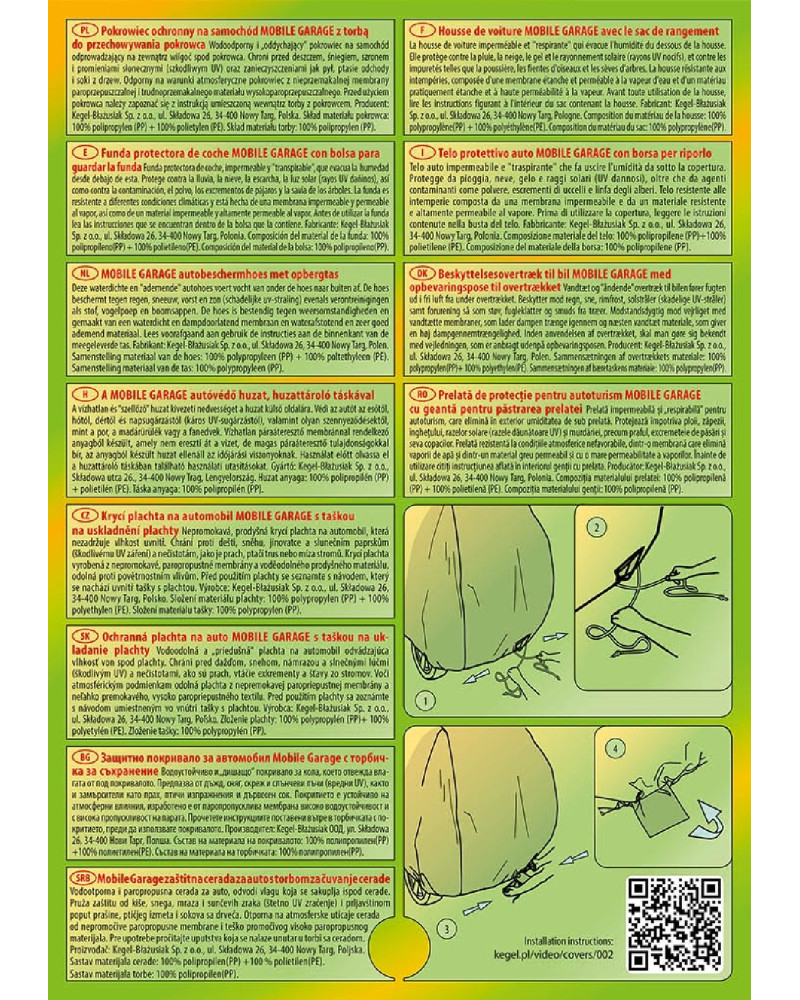 Vysoce kvalitní plachty na auto MOBILE GARAGE- voděodolné a paropropustné. Jsou ušité z nepromokavé paropropustné membrány a nesnadno promokavých materiálů, které velice dobře propouštějí páru, zachovávají si téměř naprostou těsnost a zároveň odvádějí vlhkost hromadící se pod potahem. Chrání celé auto společně s jeho dolní částí před škodlivým vlivem prostředí. Jsou odolné vůči působení UV záření. Upevňuje se s pomocí stahovacího lemu s lankem kolem celého vozidla, v případě správného zavázání zaručuje bezpečnost i během nárazů větru. Díky širokému spektru tvarů a barev jsou potahy dobře přizpůsobeny různým automobilům. Poskytnuta až do 30-měsíční záruka vám dá jistotu, že kupujete nejvyšší kvality výrobku.