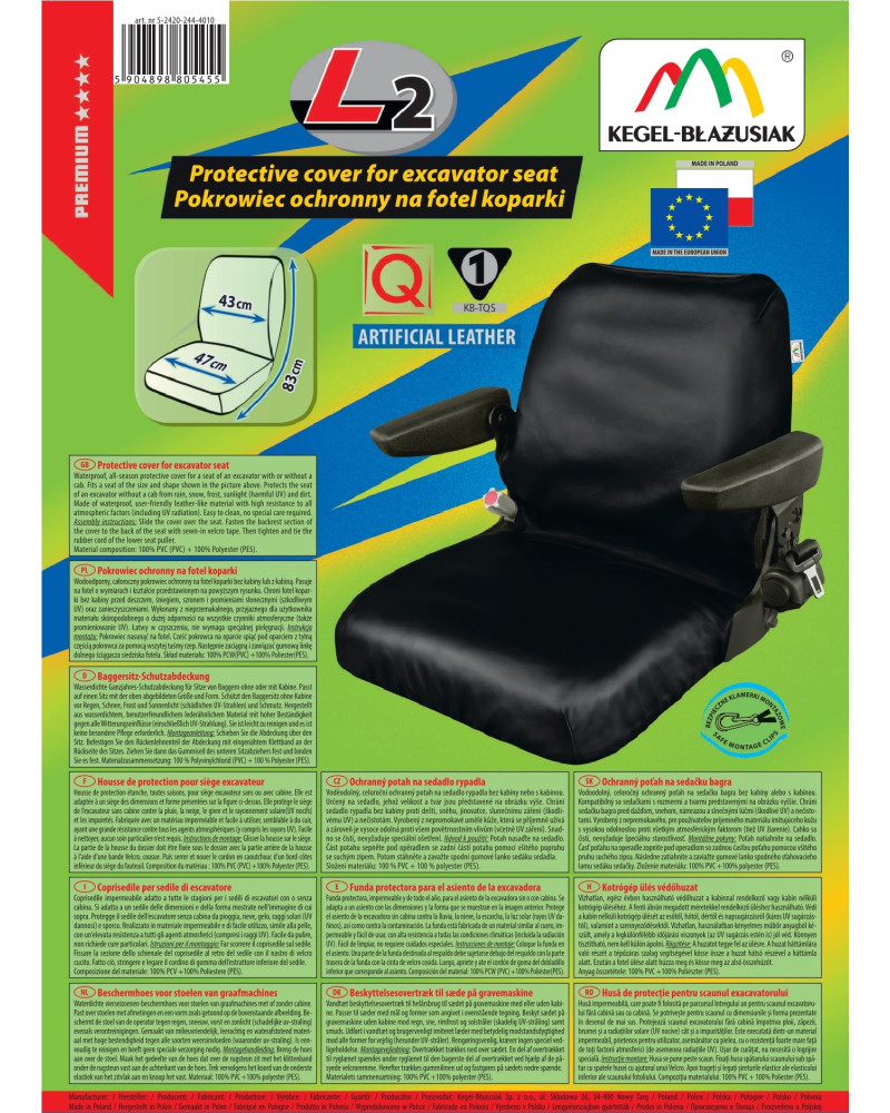 Voděodolný, celoroční ochranný potah na sedadlo rypadla s kabinou nebo bez kabiny. Určený na sedadlo, jehož velikost a tvar jsou představené na obrázku výše. Chrání sedadlo rypadla proti nečistotám a roztržení, u rypadel bez kabiny navíc chrání proti dešti, sněhu, jinovatce, slunečním paprskům (škodlivému UV záření), prachu a jiným nečistotám. Vyrobený z nepromokavé umělé kůže, která se příjemně užívá a zároveň je vysoce odolná proti všem povětrnostním vlivům (včetně UV záření). Snadno se čistí, nevyžaduje speciální ošetření.