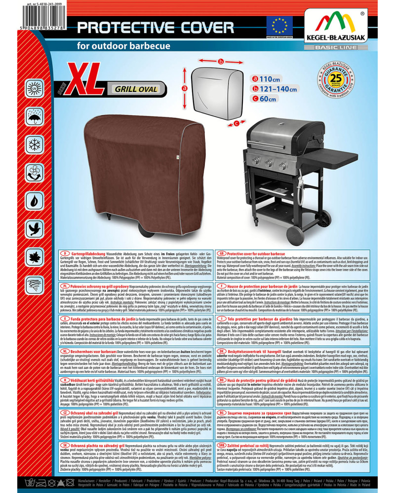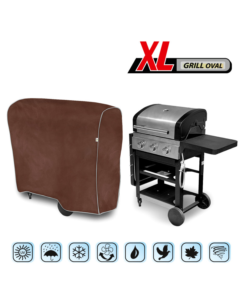 Nepromokavý obal na zahradní gril na dřevěné uhlí a plyn určený k ochraně proti nepříznivým povětrnostním podmínkám a k přechovávání grilu venku. Vhodný také k použití uvnitř budov. Chrání zahradní gril proti dešti, sněhu, jinovatce, slunečním paprskům (škodlivému UV záření) a nečistotám, jako je prach, ptačí trus nebo míza stromů. Nepromokavý obal je zcela odolný proti povětrnostním podmínkám a lze ho používat po celý rok.