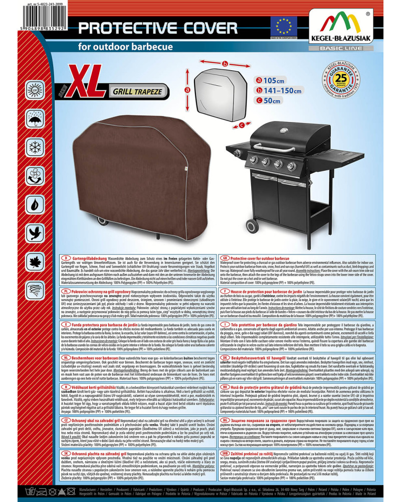 Nepromokavý obal na zahradní gril na dřevěné uhlí a plyn určený k ochraně proti nepříznivým povětrnostním podmínkám a k přechovávání grilu venku. Vhodný také k použití uvnitř budov. Chrání zahradní gril proti dešti, sněhu, jinovatce, slunečním paprskům (škodlivému UV záření) a nečistotám, jako je prach, ptačí trus nebo míza stromů. Nepromokavý obal je zcela odolný proti povětrnostním podmínkám a lze ho používat po celý rok.