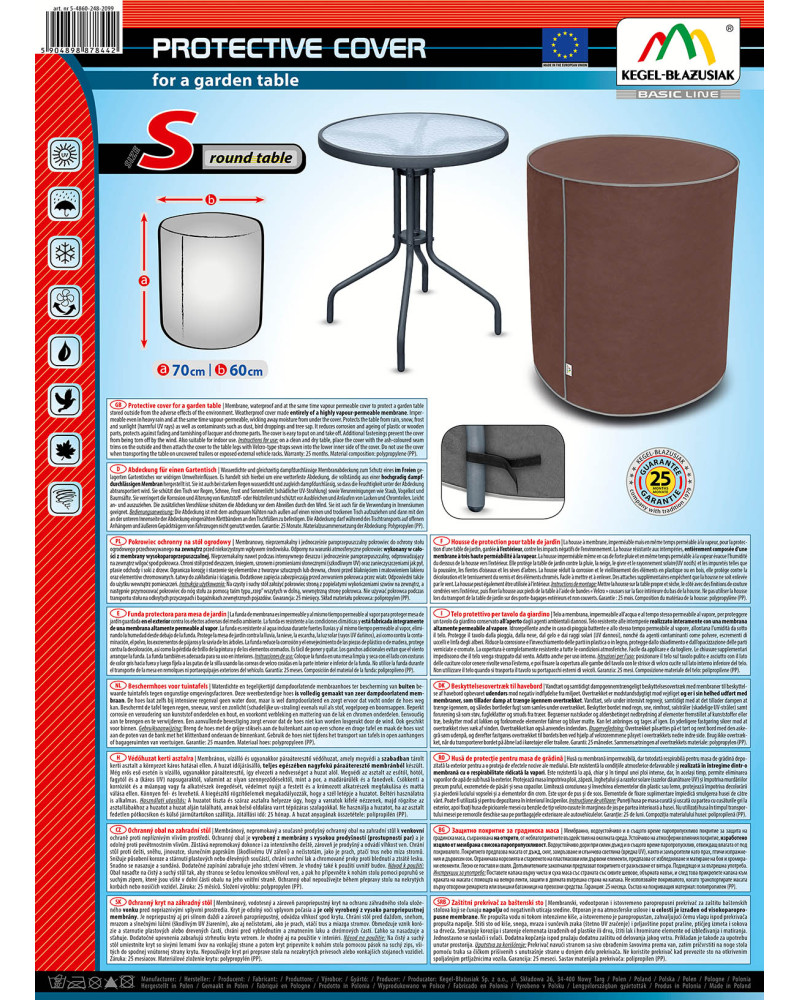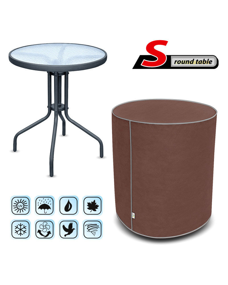Ochranný obal na zahradní stůl k celoroční venkovní ochraně proti nepříznivým vlivům počasí. Speciální složení obalu zajišťuje, že voda při dešti skrze něj neproniká, stéká po něm dolů a obal nezadržuje vodní páru. Chrání stůl proti dešti, sněhu, jinovatce, slunečním paprskům (škodlivému UV záření) a nečistotám, jako je prach, ptačí trus nebo míza stromů. Snižuje působení koroze a stárnutí plastových nebo dřevěných součástí, chrání svrchní lak a chromované prvky proti blednutí a ztrátě lesku. Ochranný obal je odolný proti každému počasí. Snadno se nasazuje a sundává. Dodatečné zapínání ho chrání proti stržení větrem. Lze ho používat také uvnitř budov.