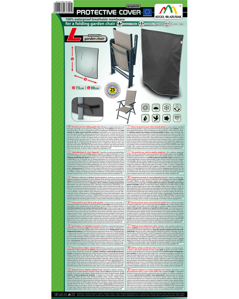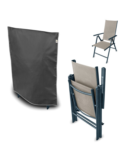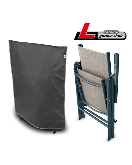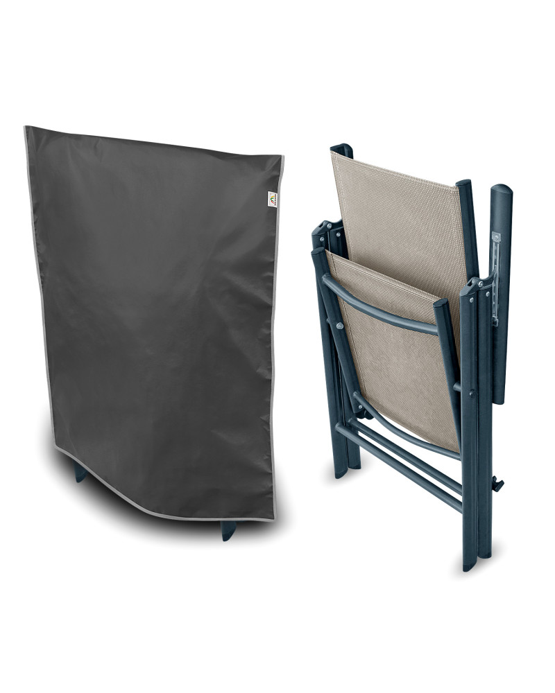Membránový, nepromokavý a současně prodyšný ochranný obal na skládací zahradní židli k její venkovní ochraně proti nepříznivým vlivům prostředí. Obal je určený pro jednu složenou zahradní židli. Ochranný obal je vyrobený z membrány s vysokou prodyšností (prostupností par) a je odolný proti povětrnostním vlivům. Zůstává nepromokavý dokonce i za intenzívního deště, zároveň je prodyšný a odvádí vlhkost ven. Chrání židli proti dešti, sněhu, jinovatce, slunečním paprskům (škodlivému UV záření) a nečistotám, jako je prach, ptačí trus nebo míza stromů. Snižuje působení koroze a stárnutí plastových nebo dřevěných součástí, chrání svrchní lak a chromované prvky proti blednutí a ztrátě lesku. Snadno se nasazuje a sundává. Dodatečné zapínání ho chrání proti stržení větrem. Je vhodný také k použití uvnitř budov.