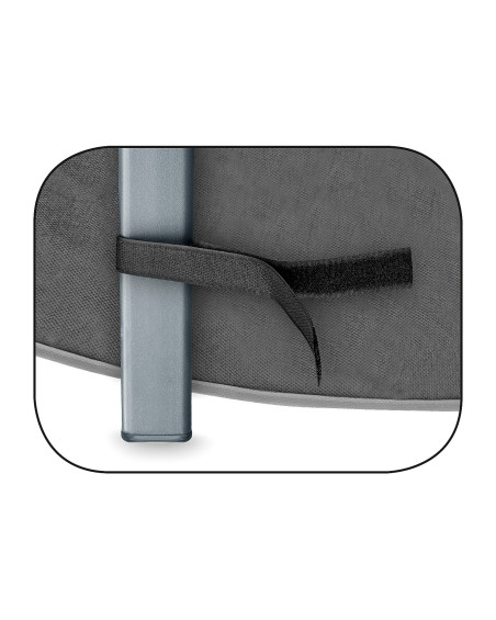 Obal nasaďte na složenou židli tak, aby stranou se šedou lemovkou směřoval ven, a pak ho připevněte k nohám židle pomoci popruhů se suchým zipem, které jsou všité v dolní části obalu na jeho vnitřní straně. Ochranný obal nepoužívejte během přepravy židle na nekrytých korbách nebo nosičích vozidel.