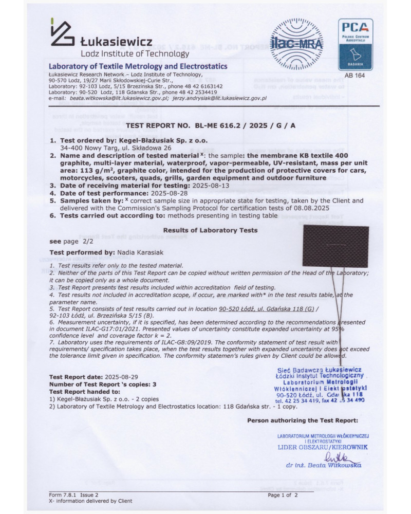 Dobrá krycí plachta musí chránit automobil nejen před atmosférickými srážkami, znečištěním a slunečními paprsky, ale musí být také bezpečná. Právě takové jsou krycí plachty na auta značky Kegel-Błażusiak. Naši odborníci se věnují dlouhodobým zkouškám krycích plachet na automobily. Testujeme je z hlediska účinnosti ochrany proti povětrnostním vlivům, odolnosti proti vodě, propustnosti vodních par směrem ven, bezpečnosti materiálu plachty vůči laku vozidla a účinnosti připevnění plachty na vozidle za běžného i extrémního počasí. Na trh dodáváme pouze takové výrobky, které v dlouhodobých testech dopadly pozitivně.