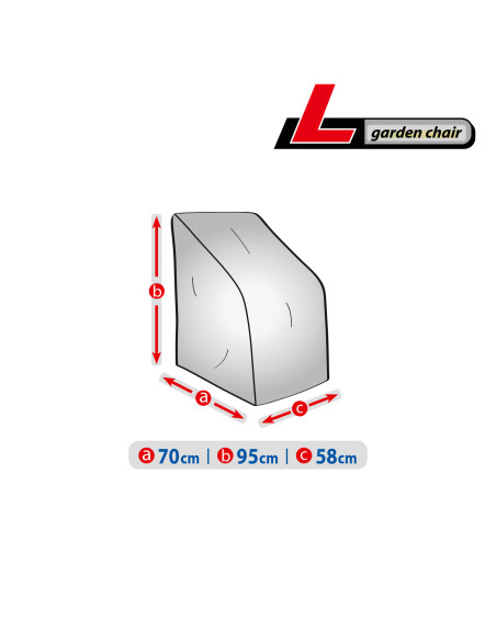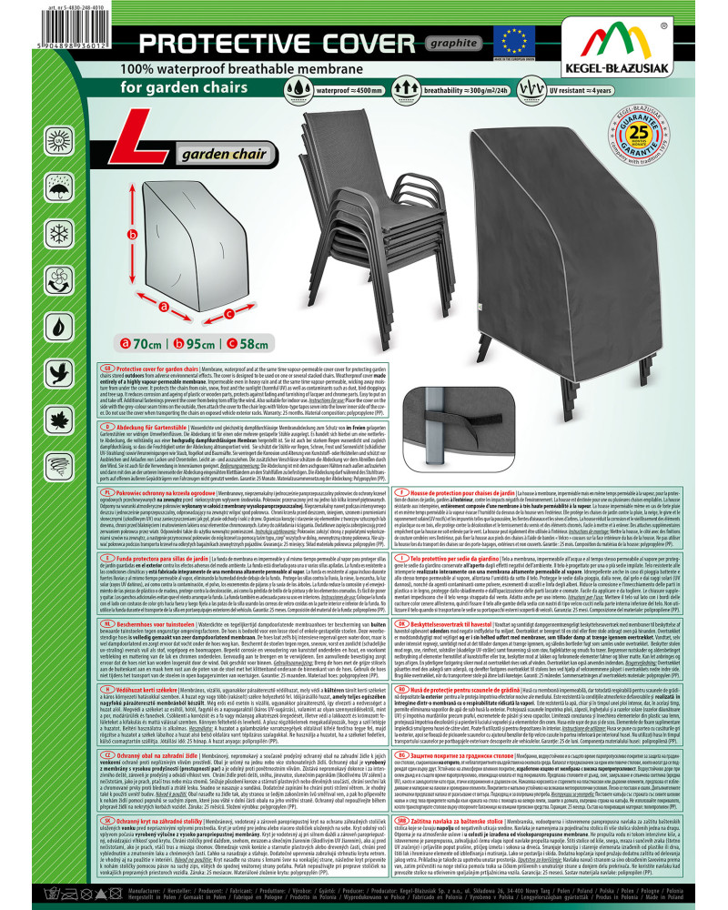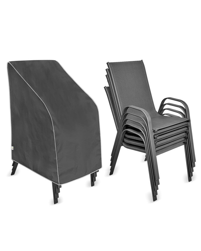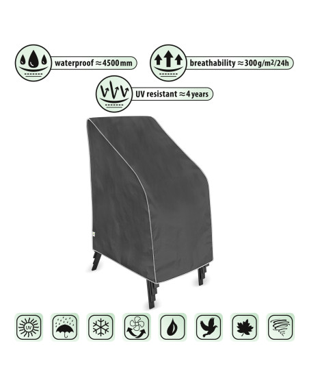 Membránový, nepromokavý a současně prodyšný ochranný obal na zahradní židle k jejich venkovní ochraně proti nepříznivým vlivům prostředí. Obal je určený na jednu nebo více stohovatelných židlí. Ochranný obal je vyrobený z membrány s vysokou prodyšností (prostupností par) a je odolný proti povětrnostním vlivům. Zůstává nepromokavý dokonce i za intenzívního deště, zároveň je prodyšný a odvádí vlhkost ven. Chrání židle proti dešti, sněhu, jinovatce, slunečním paprskům (škodlivému UV záření) a nečistotám, jako je prach, ptačí trus nebo míza stromů. Snižuje působení koroze a stárnutí plastových nebo dřevěných součástí, chrání svrchní lak a chromované prvky proti blednutí a ztrátě lesku. Snadno se nasazuje a sundává. Dodatečné zapínání ho chrání proti stržení větrem. Je vhodný také k použití uvnitř budov.
