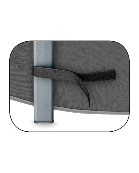 Obal nasaďte na židle tak, aby stranou se šedou úpravou švů směřoval ven, a pak ho připevněte k nohám židlí pomoci popruhů se suchým zipem, které jsou všité v dolní části obalu na jeho vnitřní straně. Ochranný obal nepoužívejte během přepravě židlí na nekrytých korbách nebo nosičích vozidel.