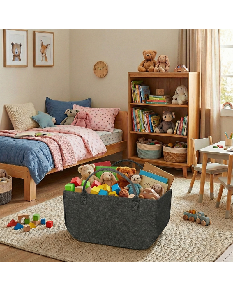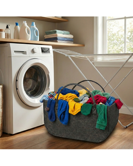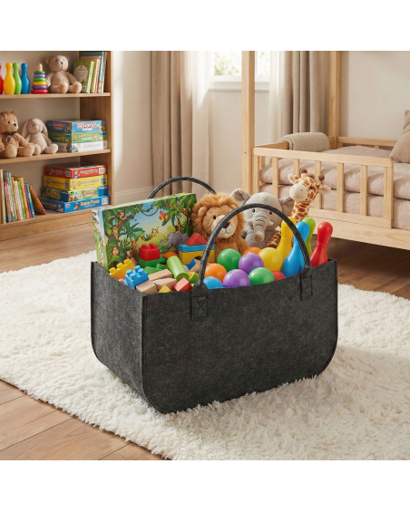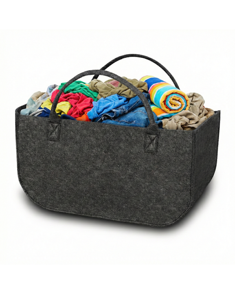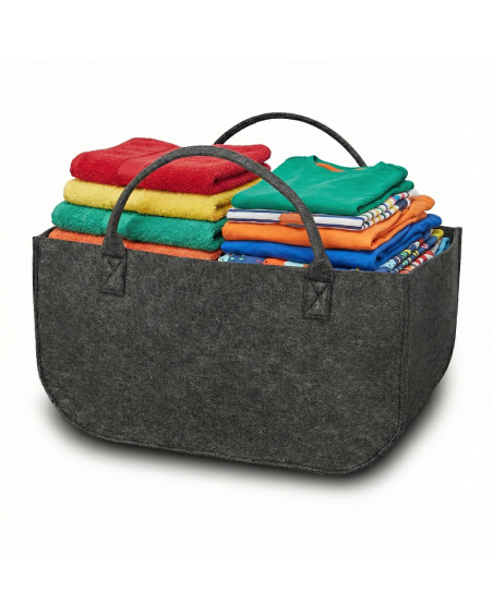 Velká taška pro nejrůznější použití, např. pro použití v domácnosti k ukládání a přenášení dřeva do krbu, dětských hraček, hraček pro psy a kočky, špinavého prádla k praní a pro mnoho dalších účelů. Taška se také velmi dobře hodí k přepravě nákupů autem a k přenášení nákupů z auta do domu. Taška je vyrobena z velmi pevného filcu o tloušťce 5 mm, který je sešitý velmi silnými jádrovými nitěmi, díky čemuž je taška velmi pevná a vždy „drží tvar“, a ucha přišitá k tašce jsou silná, pevná a pohodlná. V tašce lze přenášet břemena o hmotnosti až 30 kg.