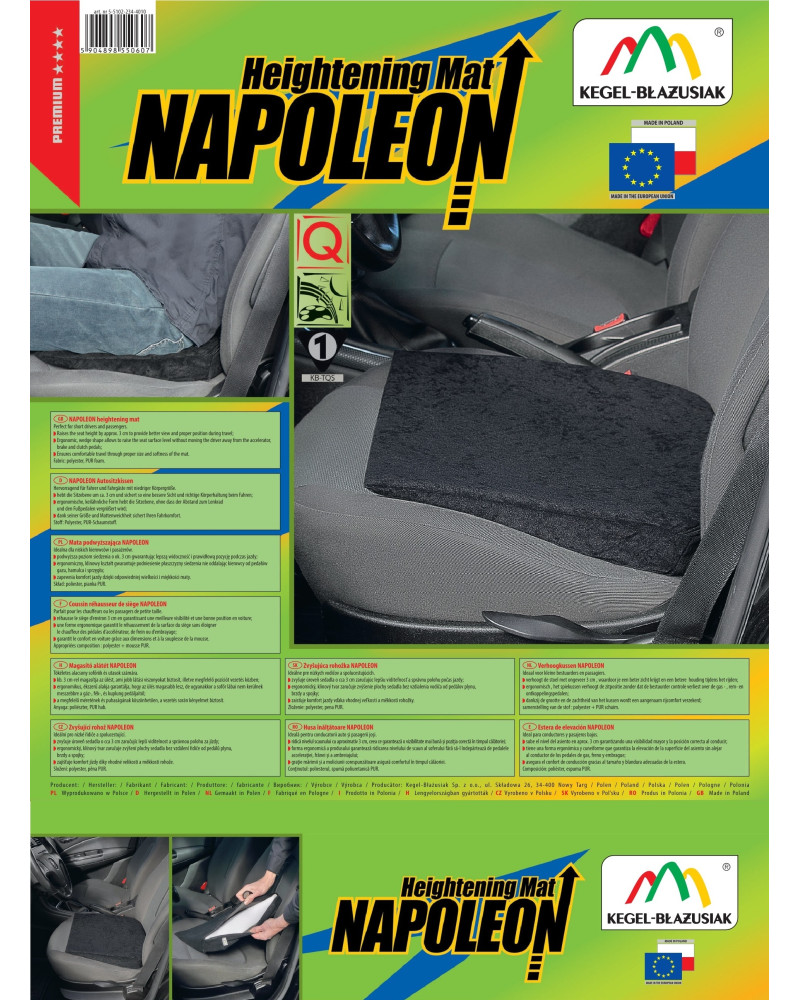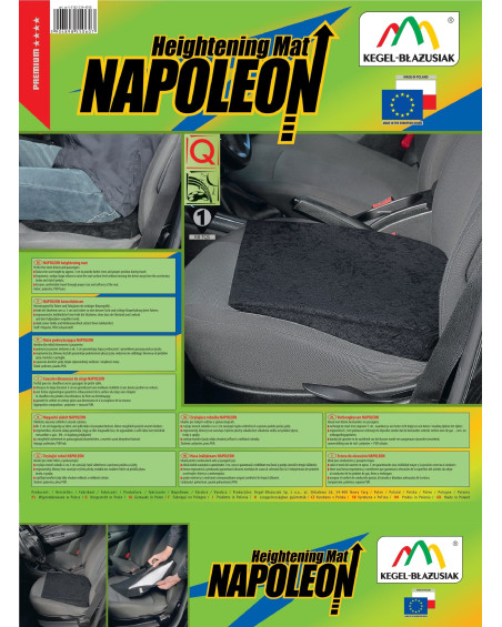 Podsedák NAPOLEON - ideální jak pro řidiče malého vzrůstu, tak i pro spolujezdce. Zvyšuje úroveň sezení o cca 3 cm. Umožňuje udržet správnou polohu během jízdy. Výrazně vyvýší danou osobu a zajistí jí lepší viditelnost. Díky speciálně zvolenému klínovému a ergonomickému tvaru nevzdaluje řidiče od pedálů plynu, brzdy a spojky. Je nesmírně praktický a kromě toho zajišťuje jedinečný jízdní komfort. Vnější strana podsedáku je zhotovena z polyesterového, vysoce kvalitního materiálu a výplň je vyrobena z PUR pěny. Díky správně zvolené tloušťce a tvrdosti pěny polštář co nejvíce vyvyšuje uživatele a zároveň si zachovává měkkost a zajišťuje uživateli pohodlí. Výplň lze bez problému vyjmout, protože všitý zip umožňuje přístup dovnitř. Po vyjmutí výplně lze potah bez obav prát na 40 stupňů. Podložka je vyrobena v černé barvě - nesmírně praktické, s téměř 100% stálostí barev. Tmavá barva zabraňuje vzniku znečištění a ideálně ladí s interiérem každého auta. Obohaťte interiér svého vozidla o elegantní výrobek nejvyšší kvality, který vám bude sloužit po dlouhá léta.