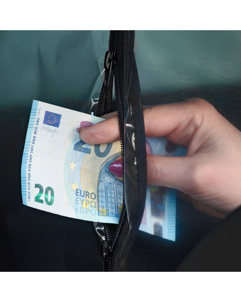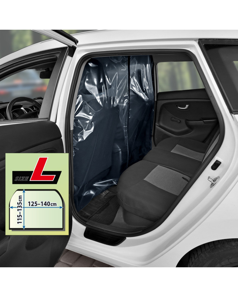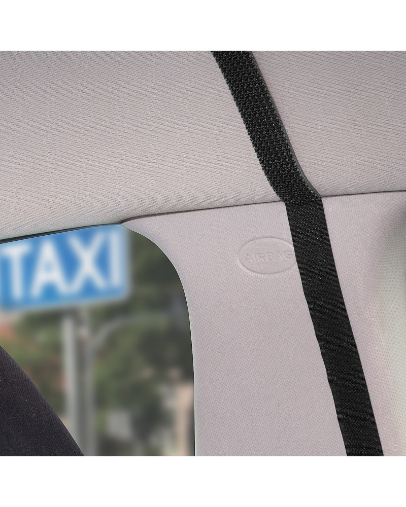 UPOZORNĚNÍ: Síla, kterou je průmyslová páska se suchým zipem nalepená, může být tak velká, že může být nemožné odlepit pásku bez poškození povrchu, ke kterému je přilepená. Přepážku umístěte v automobilu za přední sedadla, její část označená štítkem Kegel-Błażusiak se musí nacházet nahoře. Potom ji odshora připevněte tak, že pásku se suchým zipem na straně přepážky silně přitlačíte k suchému zipu přilepenému ke střeše a sloupkům automobilu. Pokud je přepážka příliš velká, udělejte záložky na pásce se suchým zipem u středových sloupků.Ve spodní části přepážky rozepněte zdrhovadlo, kterým vytvoříte požadovaný výřez pro středový kanál v podlaze automobilu. Na připevňovací smyčky nasaďte háčky, které jsou součástí balení. Spodní část přepážky zasuňte pod sedadla a připevněte ji pomocí háčků ke spodní konstrukci sedadel. Rozepnutím zipu v opačném směru získáte otvor, kterým může řidič převzít platbu od cestujících na zadním sedadle.