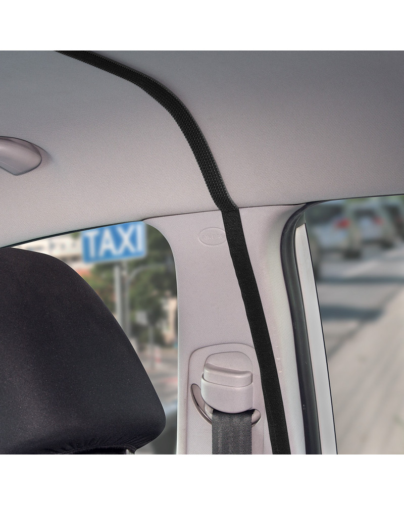 Na vnitřní plochu střechy automobilu mezi B sloupky nalepte samolepicí průmyslovou pásku se suchým zipem, která je označená červenou fólií (viz fotografie č. 1). Na vnitřní stranu sloupků za držáky bezpečnostních pásů pak nalepte samolepicí pásku se suchým zipem označenou bílou fólií (pásku ustřihněte na požadovanou délku). Pásky při lepení silně přitlačte, abyste zajistili co nejlepší spojení lepidla s povrchem. Průmyslová páska se suchým zipem dosáhne maximální přídržnosti po 24 hodinách od nalepení, proto k ní hygienickou přepážku připojte teprve po uplynutí této doby.