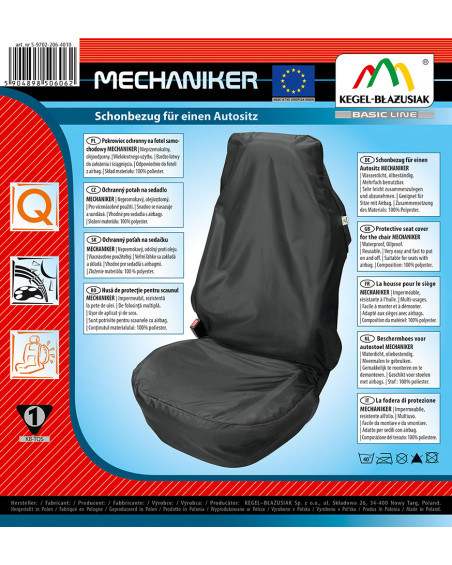 Ochranný potah MECHANIKER, levnější verze potahu Mechanicus+. I tento potah je vyroben z nesnadno promokavého a olejivzdorného šusťáku- nesmírně silného a stálého, což mu zajišťuje dlouhou životnost. Potah účinně chrání sedačku před znečištěním a zničením. Vyroben v univerzální velikosti, hodí se na většinu standardních autosedaček. Uzpůsoben také pro auta s bočními airbagy v sedačkách. Potah kryje celou sedačku společně s jejími boky a opěrkou hlavy. Potah je přizpůsoben pro sedačky s bočními airbagy. Velmi snadno se čistí - lehké nečistoty lze setřít vlhkým hadříkem, v případě větších lze potah vyprat. Vyroben v univerzální velikosti, hodí se na všechny standardní autosedačky.
