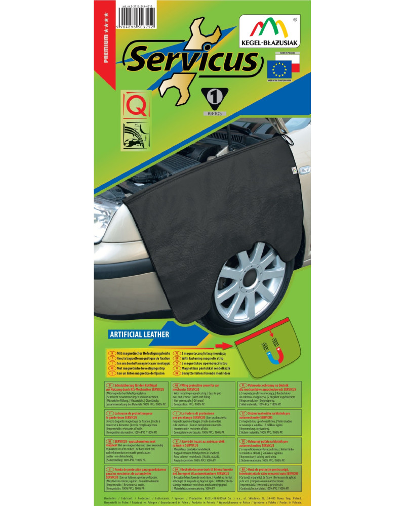 Ochranný potah na blatník SERVICUS – z ekokůže nové generace – nepromokavý a olejivzdorný- zajistí spolehlivou ochranu konkrétních částí auta. Je vyroben z nesmírně stálé látky odolné vůči poškozením různého typu. Ekologický výrobek určený k opakovanému použití. Velmi snadno se nasazuje a sundává; pohodlně se skladuje/převáží, protože po složení nezabere příliš místa. Výrobek se velmi snadno čistí - veškeré nečistoty na potahu stačí otřít vlhkým hadříkem nasáklým kapalinou. Při nákupu našich potahů máte jistotu, že získáte výrobek nejvyšší kvality.