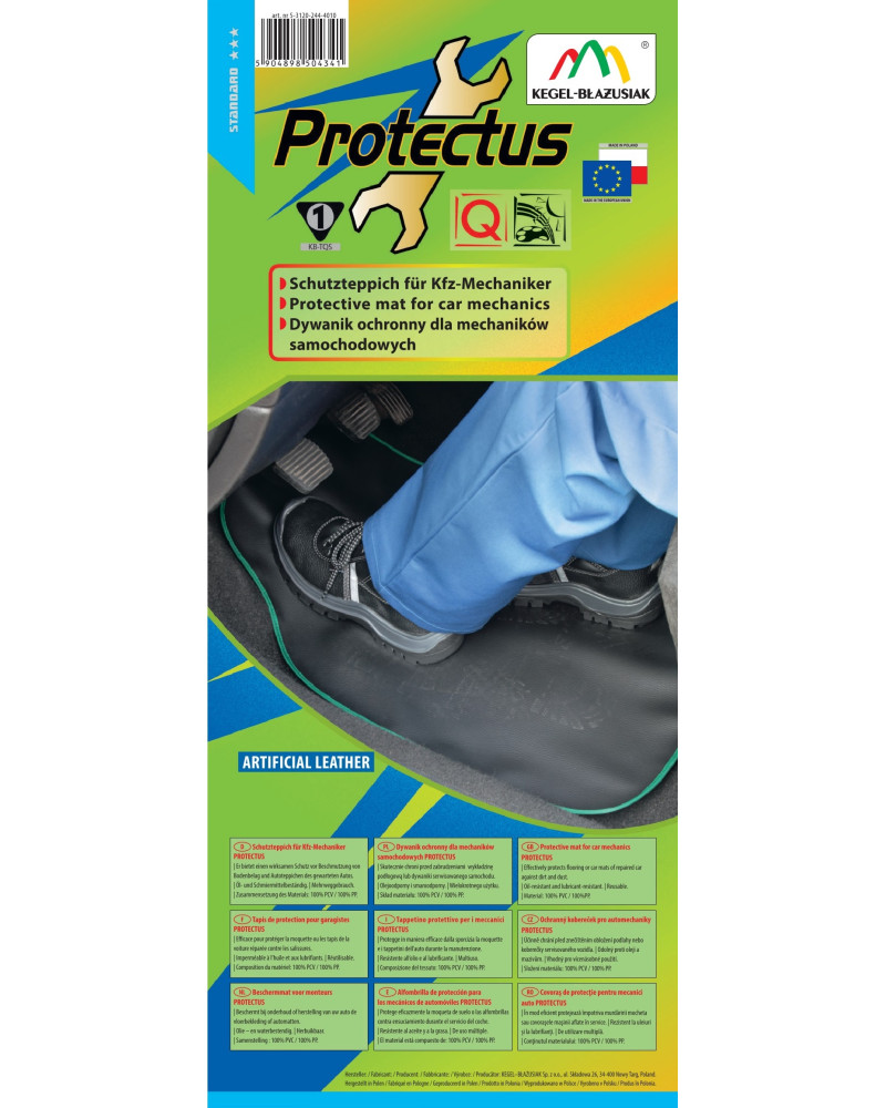 Kobereček PROTECTUS nesmírně dobře chrání čalounění opravovaného auta před poškozením a znečištěním a zároveň zvyšuje pracovní komfort mechanika. Kobereček je vyroben z nesmírně stálé látky, odolné vůči poškozením různého druhu. Do auta ho lze umístit velmi snadno; pohodlně ho lze uskladnit/převážet, protože nezabere příliš místa. Velmi snadno se čistí, protože veškeré nečistoty na koberečku stačí otřít vlhkým hadříkem nasáklým tekutinou. Ochranný potah PROTECTUS se vyrábí v univerzální černé barvě, díky tomu vypadá dobře a nesmírně prakticky se používá. Zakončen jemnou lemovkou zelené barvy. Výrobek se velmi snadno čistí. Veškeré nečistoty lze odstranit s pomocí vlhkého hadříku a kapaliny.