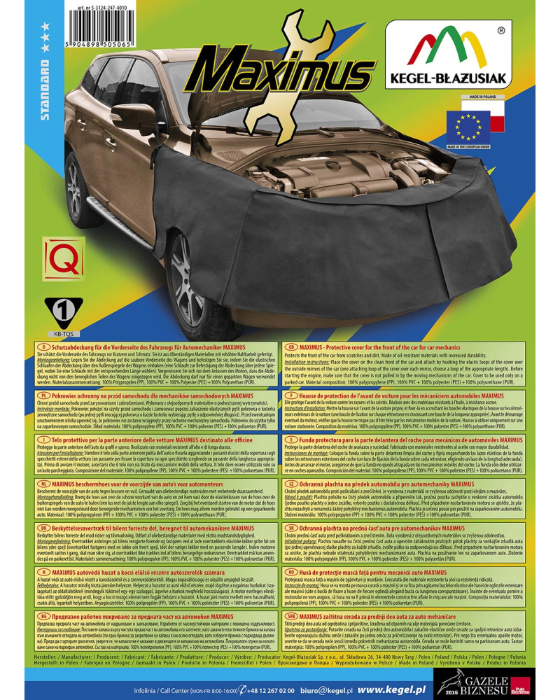 Potah byl profesionálně vyroben a pečlivě povrchově upraven. Textilie SPUNBOND, z níž byl potah ušit, je odolná proti poškozením různého typu. Zespodu najdete měkkou látku, která je bezpečná pro karoserii. Na místě světel byla použita hustá síť, která zabraňuje poškození skel reflektorů. Díky ní také není nutné stahovat plachtu např. kvůli kontrole správnosti připojení demontovaných elektrických prvků. Ochranný potah MAXIMUS se vyrábí v univerzální černé barvě, díky tomu vypadá dobře a nesmírně prakticky se používá. Velice snadno se čistí - veškeré nečistoty lze odstranit s pomocí vlhkého hadříku a tekutiny.