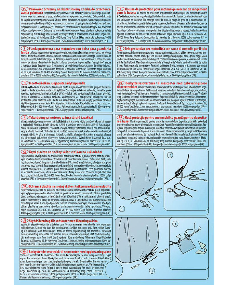 Čistý a suchý sněžný skútr přikryjte plachtou tak, aby strana s potiskem byla na vnější straně. Pro snadnější nasazování krycí plachty na sněžný skútr je do plachty našitá nášivka FRONT v její přední části a REAR v její zadní části (označení odpovídá přední a zadní straně skútru). Překřižte stahovací lanka, jednou obtočte kolem sebe a následně silně stáhněte rovnoměrnou silou směrem k zadní straně vozidla (viz obrázek 2 na vnějším štítku plachty). Konce stahovacího lanka zavažte na uzel a zkontrolujte, zda se uzel při zatažení za lanko neuvolňuje. Pokud se uzel uvolní, zopakujte předchozí krok, ale použijte jiný způsob vázání uzlu. Do spodního okraje plachty jsou všité upevňovací pásy, které musíte všechny protáhnout pod sněžným skútrem a pak je sepnout sponami a stáhnout.