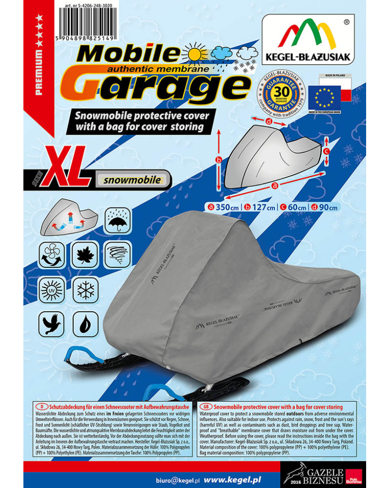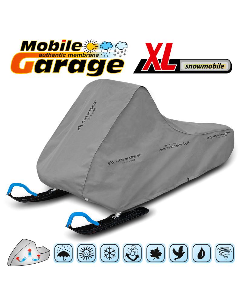Nepromokavá krycí plachta na sněžný skútr parkovaný venku k jeho ochraně proti nepříznivým povětrnostním podmínkám. Vhodná také k použití uvnitř budov. Chrání proti dešti, sněhu, jinovatce, slunečním paprskům (škodlivému UV záření) a nečistotám, jako je prach, ptačí trus nebo míza stromů. Tato nepromokavá a prodyšná membránová krycí plachta nezadržuje vlhkost pod plachtou. Je odolná proti povětrnostním podmínkám.