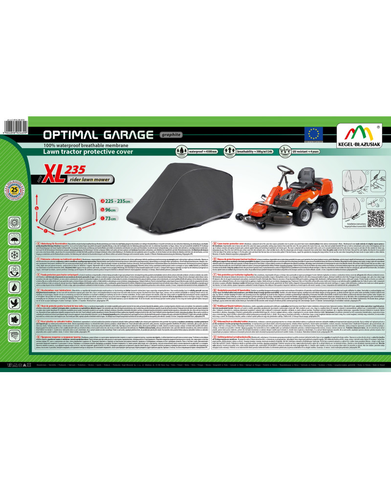 Krycí plachta na benzínový zahradní traktor celoročně parkovaný venku k ochraně před nepříznivými povětrnostními podmínkami. Speciální složení plachty zajišťuje, že voda při dešti neproniká pod plachtu, stéká po ní dolů a plachta nezadržuje vodní páru. Chrání zahradní traktor proti dešti, sněhu, jinovatce, slunečním paprskům (škodlivému UV záření) a nečistotám, jako je prach, ptačí trus nebo míza stromů. Snižuje působení koroze a stárnutí plastových součástí, chrání svrchní lak a chromované prvky proti blednutí a ztrátě lesku. Krycí plachta je zcela odolná proti každému počasí.
